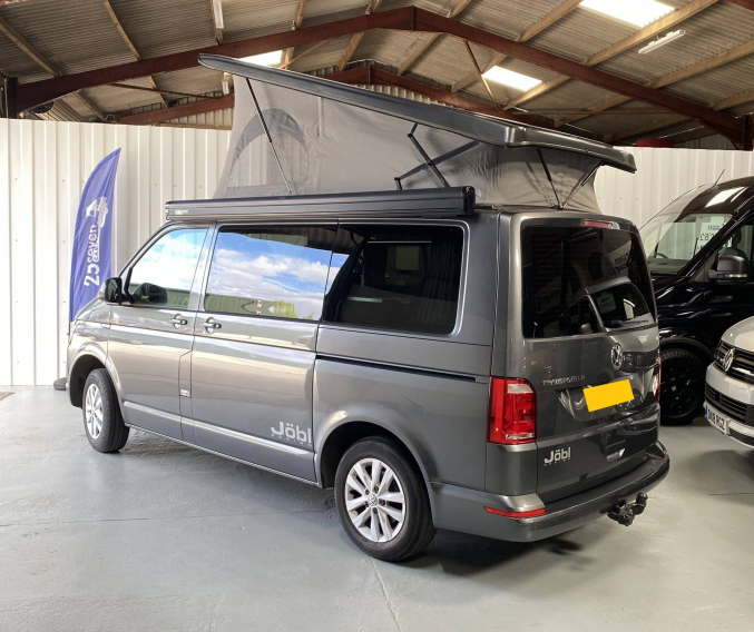 JOBL Design are stylish yet practical National Caravan Council Approved camper conversions featuring high end components such as the market leading wider than standard 120cm RIB bed and VW approved SCA pop-top roof with sprung bed and higher lift rear hinges. Registered as a Motor Caravan on the V5, its quality is evident throughout with flush soft close cupboards, gas grill, diesel heating and even a hot water system. This example also has a roof mounted solar panel, Fiamma wind out awning, tow bar and a Porta Potti. As with every camper we sell, it will be supplied with a fresh Habitation safety certificate.