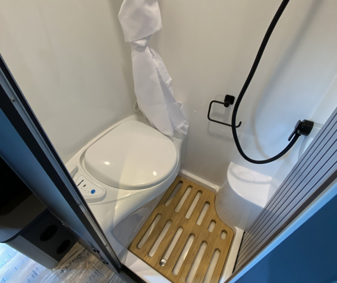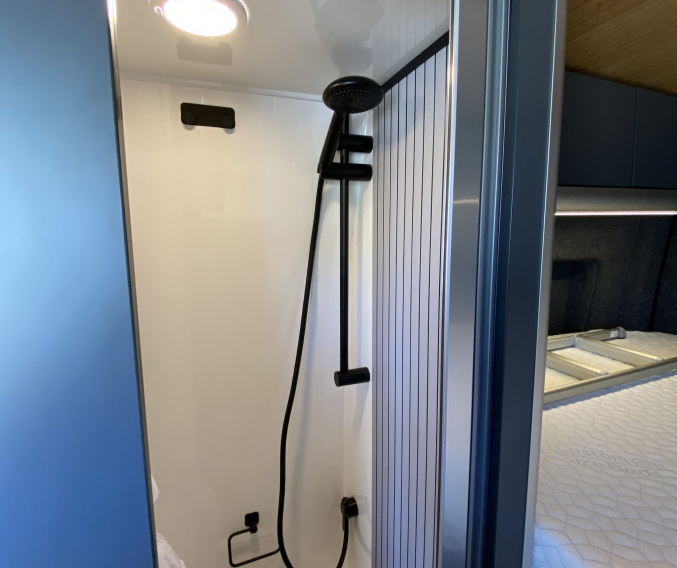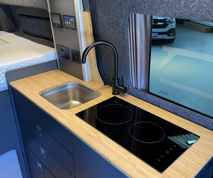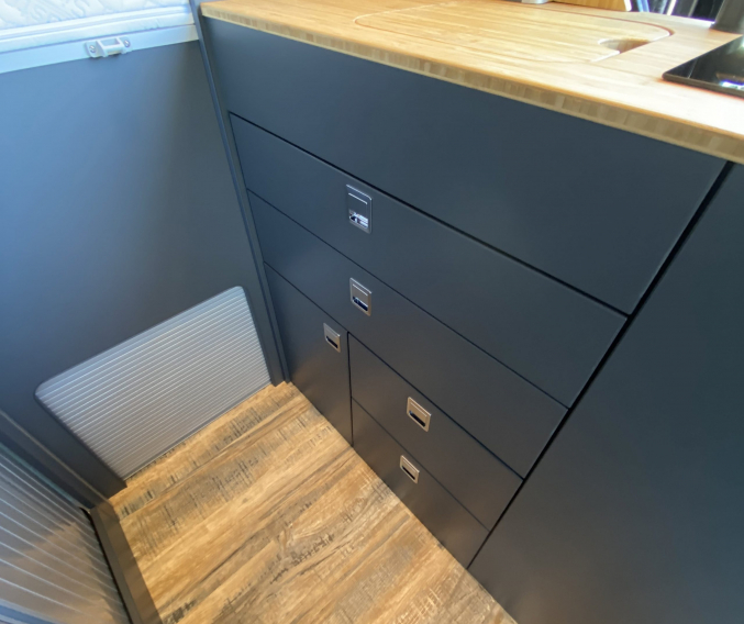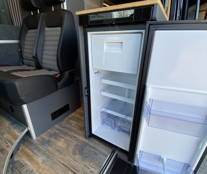 Converted on a brand new delivery miles Crafter this 2-berth conversion has been built using the excellent Evo Design units for a high quality professional finish. Its front lounge with seating for four leads to a central kitchen with toilet / shower cubicle and onto a large rear double bed with garage space underneath. Features include a Truma diesel combination boiler providing both heating and hot water, full size cassette toilet, interior and exterior activity shower, 63l fresh and 70l waste water tanks with gauges, large 230v Fogstar Drift Pro lithium leisure battery, 175w roof mounted solar panel, Victron Energy 2000w inverter, 90L Thetford fridge / freezer, ceramic 2 burner hob, remote control ceiling ventilation, zoned 12v lighting and Fiamma wind out awning. As with every camper we sell, it will be supplied with a fresh Habitation safety certificate.