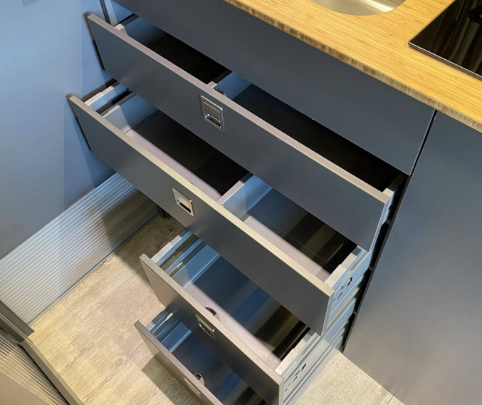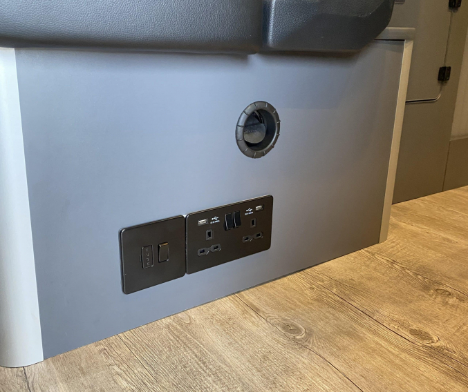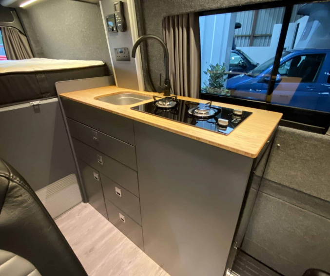 The brand new conversion has been built using the excellent Evo Design units for a high quality professional finish. Its front lounge with seating for four leads to a central kitchen area with toilet cubicle and large rear double bed with garage space underneath. Features include Trauma gas heating and hot water system with shower point, remote control ventilation, large 84L fridge, twin leisure batteries, 12v to 240v invertor, cassette toilet and Fiamma wind out awning. As with every camper we sell, it will be supplied with a fresh Habitation safety certificate.