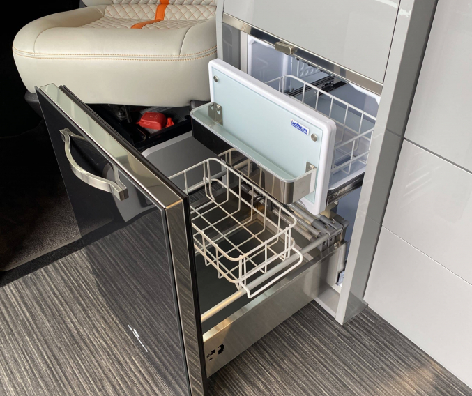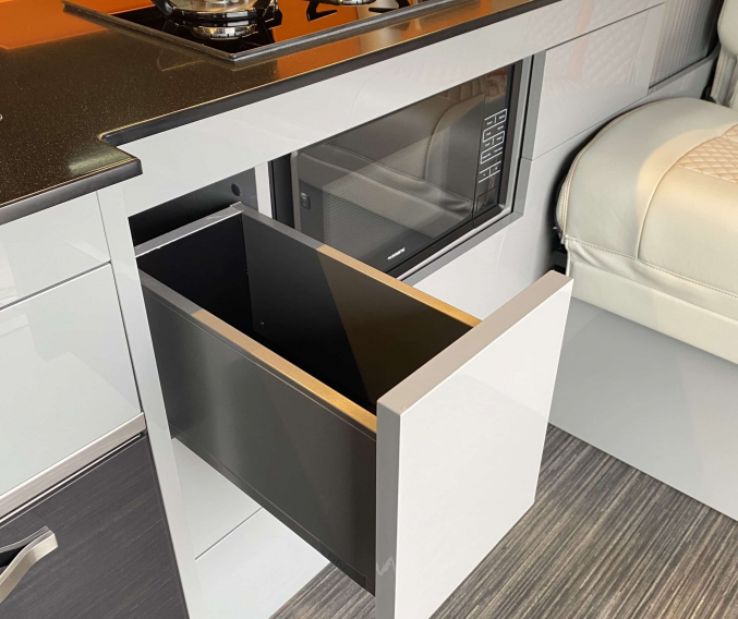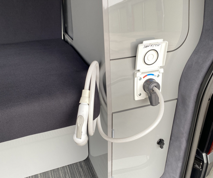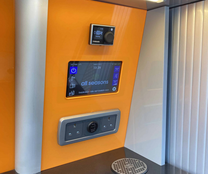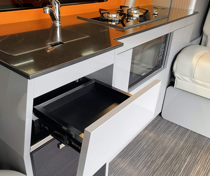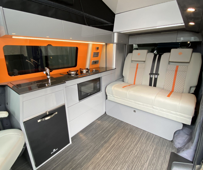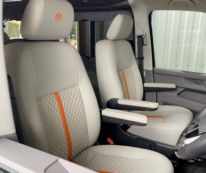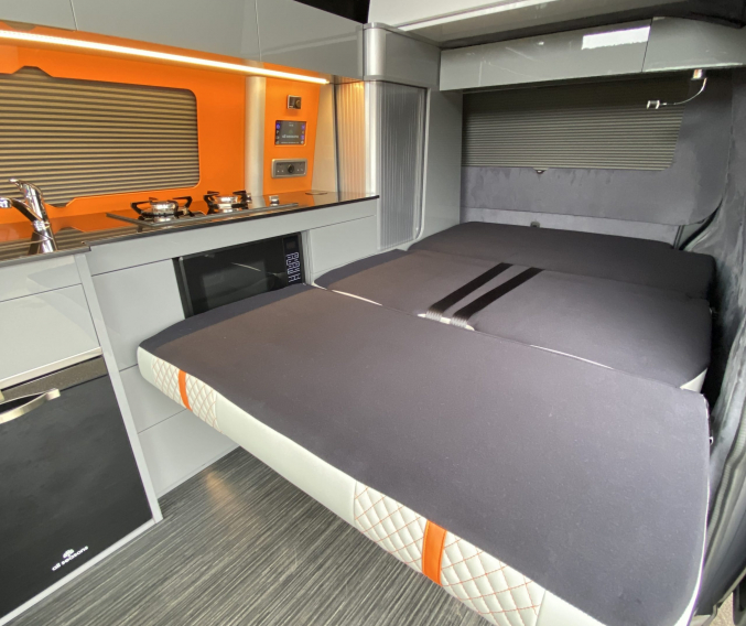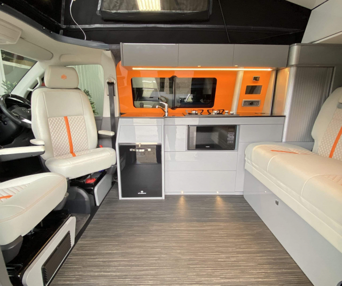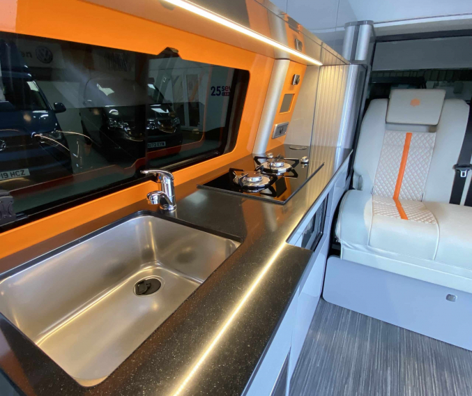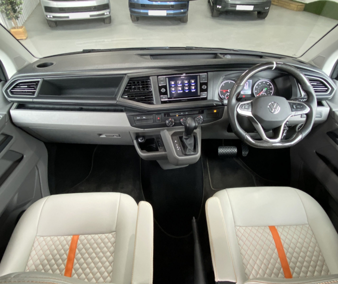 Converted from new by All Seasons Leisure, this is a high quality conversion that not only looks good but is practical too. Featuring the market leading RIB bed with single captains seats up front, its upholstery matches the camper perfectly with hints of orange. It has Webasto diesel heating, twin gas hob, microwave, wireless phone charger, underslung water tanks, Vanshades blinds, roof mounted solar panel, Fiamma wind out awning, external gas BBQ point, Loc-8 door mounted table and a Brink detachable tow bar. It even has a Webasto hot water system with activity shower. As with every camper we sell, it will be supplied with a fresh Habitation safety certificate.