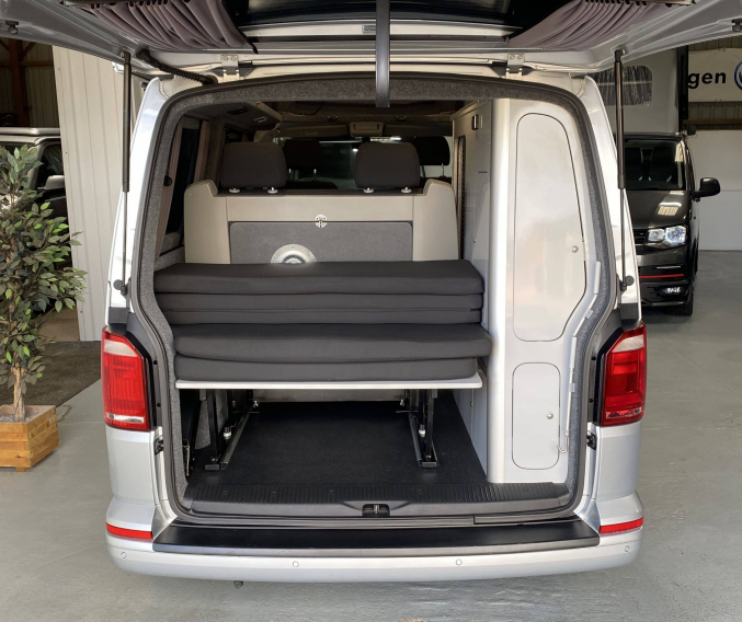 Converted by Exploria, this is their Rhythm model which features the VW California sliding bed on rails with IOSFIX. Well built with plenty of clever and practical storage, it has a single front passenger seat with swivel bases on both front seats and is a factory glazed tailgate model. Other features include a quality Reimo pop-top roof, TV monitor, Webasto diesel heating, Fiamma wind out canopy, VW bike rack, Westfalia removable tow bar and lowered suspension. As with every camper we sell, it will be supplied with a fresh Habitation safety certificate.